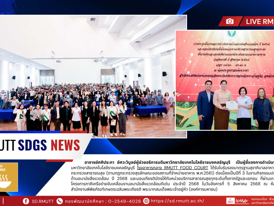 โรงอาหารกลาง มหาวิทยาลัยเทคโนโลยีราชมงคลธัญบุรี โรงอาหารกลาง RMUTT Food Court ได้รับใบรับรองมาตรฐานสุขาภิบาลอาหาร SAN ของกรมอนามัย กระทรวงสาธารณสุข (ตามกฎกระทรวงสุขลักษณะของสถานที่จำหน่ายอาหาร พ.ศ.2561) ต่อเนื่องเป็นปีที่ 3